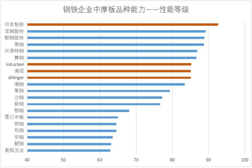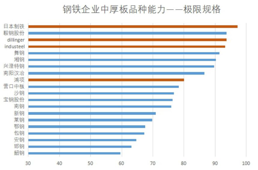 國際上的Indu-Steel、德國Dillinger和韓國浦項以及國內的鞍鋼,其綜合品種能力稍遜并緊跟日本制鐵的步伐。對于國內企業唯一跑在前面的鞍鋼,在部分重點領域的品種短板也對綜合能力的提升產生阻礙。