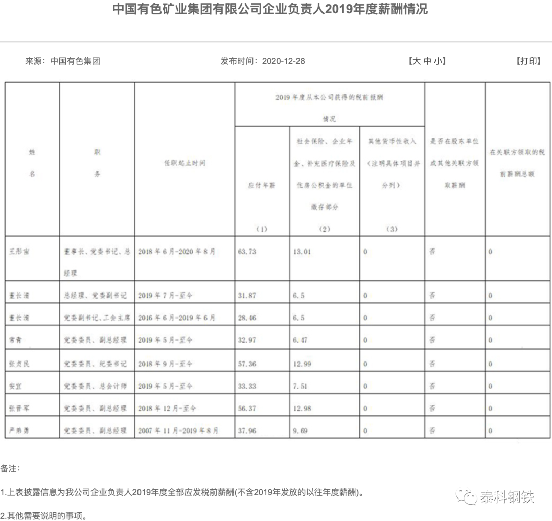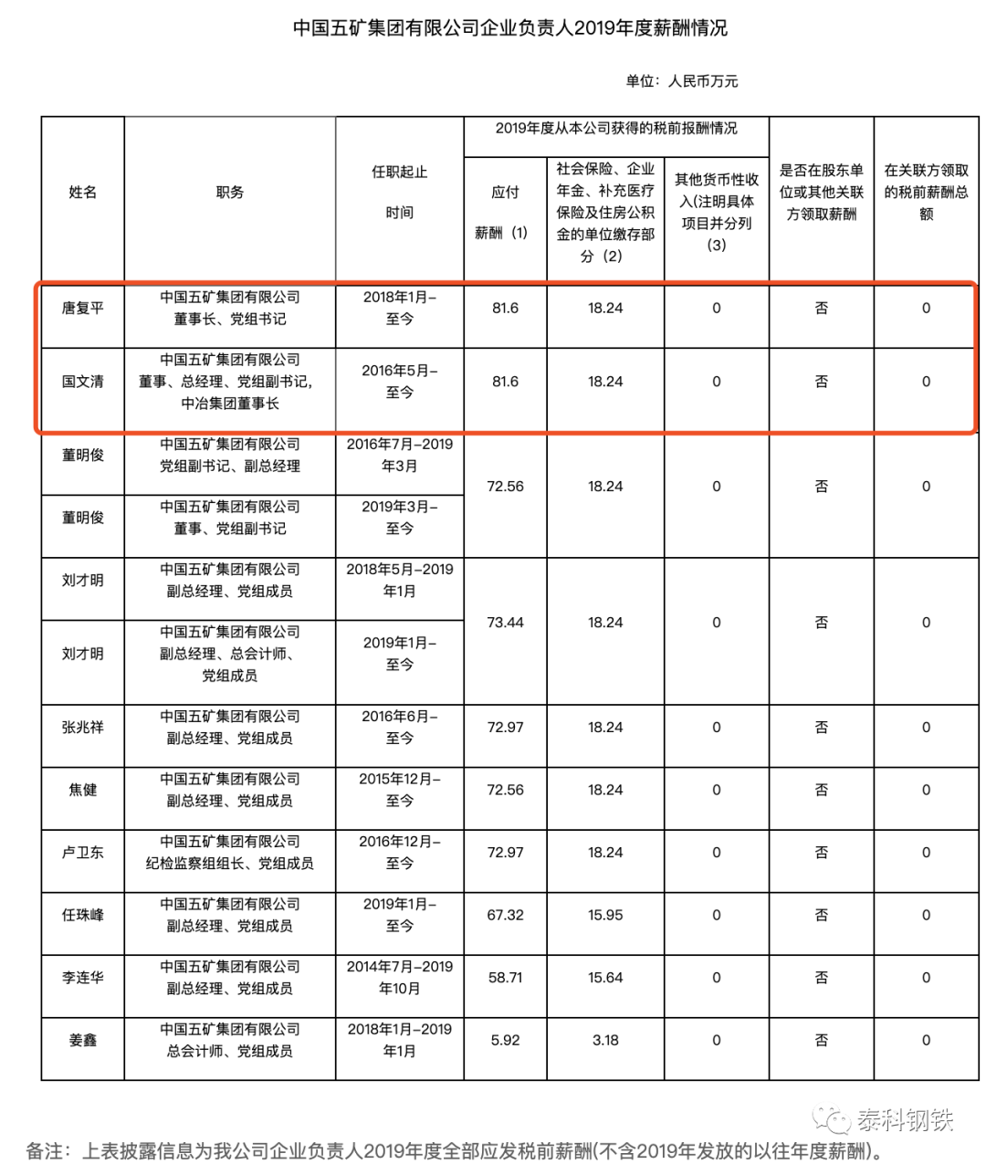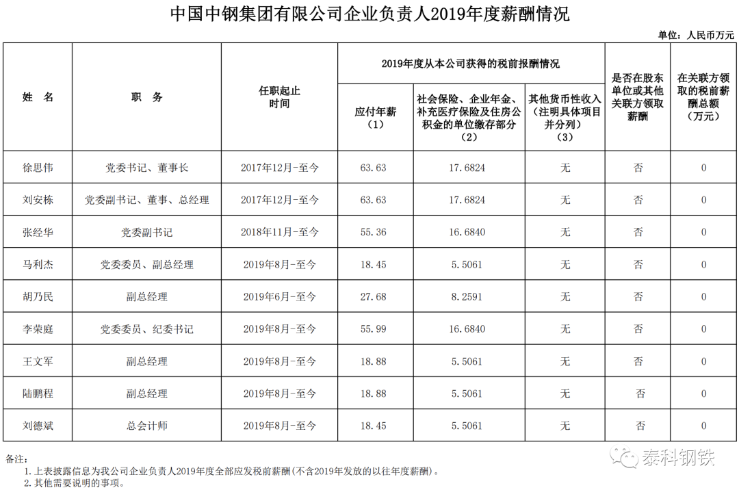 2020年12月底,中國寶武、鞍鋼、五礦、中鋼集團、中鋁集團、新興際華、中國鋼研等鋼鐵冶金行業相關央企負責人2019年度薪酬情況陸續公布,具體薪酬表如下: