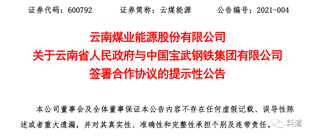 2月1日午間,云南煤業能源股份有限公司公告披露,云南省人民政府與中國寶武鋼鐵集團有限公司(下稱中國寶武)簽署合作協議,雙方將以云南方持有昆明鋼鐵控股有限公司(下稱昆鋼控股)10%的股權,中國寶武持有昆鋼控股90%的股權為目標開展深化合作。