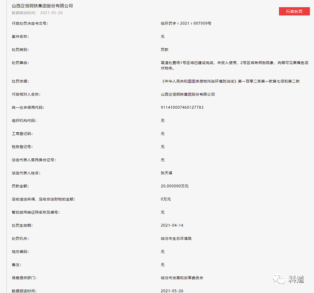 中國網財經5月27日訊 信用中國(山西)網站5月26日公示的一則行政處罰信息顯示,近日,山西立恒鋼鐵集團股份有限公司因“尾渣處置場1號區域已建設完成,未投入使用,2號區域有傾倒現象,肉眼可見黑褐色泥狀物體”,被臨汾市生態環境局依據《中華人民共和國固體廢物污染環境防治法》(以下簡稱《固廢污染防治法》)第一百零二條第一款第七項和第二款罰款20萬元。