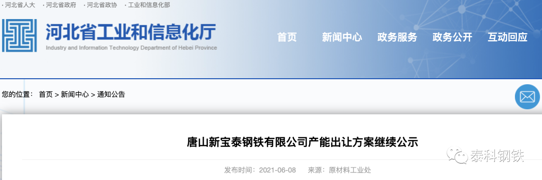 唐山新寶泰鋼鐵有限公司產能出讓方案于2020年1月13日在我廳網站進行了公示,因公示期間國家暫停了鋼鐵產能置換政策,我廳于2020年1月31日暫停唐山新寶泰鋼鐵有限公司產能出讓方案公示。今年5月6日,工業和信息化部印發了修訂后的鋼鐵行業產能置換實施辦法,自6月1日起施行。根據新修訂的置換辦法要求,現對唐山新寶泰鋼鐵有限公司產能出讓方案繼續進行公示,歡迎社會公眾進行監督。公示期為2021年6月8日至2021年6月22日。聯系電話:0311-87800210。