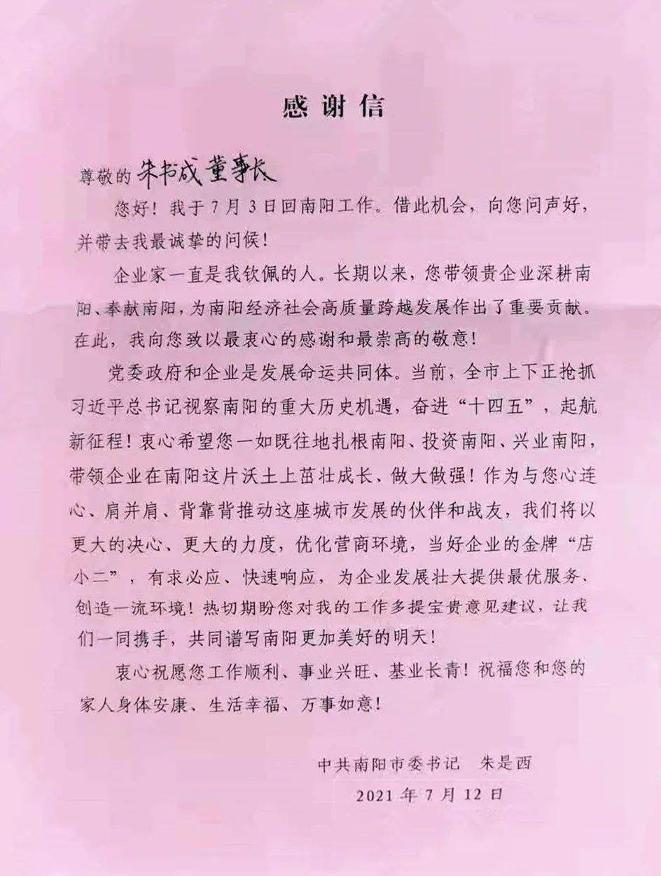 7月12日,朱書成收到了一封來自市委書記朱是西的感謝信。這封信,傳遞了朱書記對(duì)龍成集團(tuán)以及朱書成深耕南陽、奉獻(xiàn)南陽,為南陽經(jīng)濟(jì)社會(huì)高質(zhì)量跨越式發(fā)展作出重要貢獻(xiàn)的衷心感謝,字里行間流露著朱書記對(duì)企業(yè)家誠(chéng)摯的感情和殷切的期望,蘊(yùn)含著為企業(yè)發(fā)展壯大提供服務(wù)、創(chuàng)造一流環(huán)境的決心。