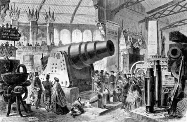 1867年,德國在第二屆巴黎世博會上展出克虜伯軍工廠生產(chǎn)的全鋼線膛后裝大炮