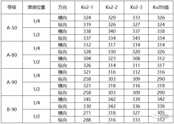 可見,無論是50mm厚、還是80mm、90mm厚的EH40、EH47厚板鋼的強(qiáng)度性能及硬度性能均滿足規(guī)范標(biāo)準(zhǔn)的要求,并且具有一定的富余量。采用同一成分A軋制的EH47、厚度分別為50、80、90mm厚度的鋼板,可以看出隨著厚度增加,強(qiáng)度有下降,同時在板厚度1/2和1/4處的強(qiáng)度差異略有增加。但硬度上的差異比較明顯,同一成分軋制不同厚度的鋼板,硬度最大相差30Hv10。而不同成分軋制的EH40、EH47的90mm厚鋼板,由于EH40有更低的Ceq,強(qiáng)度、硬度低于EH47同等厚度鋼板。