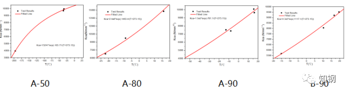 1為試制的EH40、EH47厚板的低溫夏比沖擊性能的結(jié)果。根據(jù)檢驗結(jié)果,可以看出A、B兩種成分的鋼、應(yīng)用同一成分A軋制的不同厚度EH47鋼板在-40°C時都具有較高的沖擊功,最低也在260J以上,由于軋制壓縮比不同,隨厚度的增加沖擊功略有下降。不同Ni含量相同厚度規(guī)格的EH40、EH47在-40°C時的沖擊功大小差別不大,沖擊功轉(zhuǎn)變曲線的上平臺幾乎沒有差別。但由于壓縮比不同及Ni含量不同導(dǎo)致的低溫韌性差異在夏比沖擊的連續(xù)溫度韌脆轉(zhuǎn)變曲線和隨后的雙重拉伸測定Kca數(shù)值的試驗中表現(xiàn)明顯。這也就是為什么不能單純用低溫夏比沖擊功來衡量止裂鋼的低溫性能的原因。