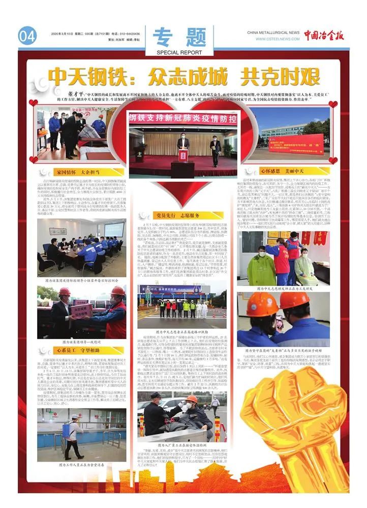 在打響新冠肺炎疫情防控阻擊戰(zhàn)的第一時間,集團就成立以董事局主席、總裁、黨委書記董才平為組長的疫情防控領導小組,確保疫情防控和安全生產兩手抓、兩手硬,并在全面做好內部防控工作的同時,積極履行社會責任、全力展現(xiàn)大企擔當,累計捐款4000萬元支持政府抗擊疫情。此外,3月1日,集團黨委發(fā)布《致全體黨員干部及廣大員工捐款倡議書》,集團上下積極響應、主動參與,在董才平的帶領下,共募集愛心款近20萬元,將全部用于慰問戰(zhàn)斗在疫情防控第一線的醫(yī)務人員、基層干部、公安民警和社區(qū)工作者等,資助因患新冠肺炎而遇到生活困難的群眾等。自新冠肺炎疫情爆發(fā)以來,集團上下高度重視,集團董事局主席、總裁、黨委書記董才平多次指示,特殊時期,更要體現(xiàn)集團對員工的關愛,一定要把"以人為本、關愛員工"的工作方針落到實處。2月6日、11日、13日,集團領導董才平、李軍、許九華等先后奔赴一線員工臨時宿舍和食堂走訪慰問,送上物資用品,為員工加油打氣。董才平指出,特殊時期,不論是在家辦公還是堅守崗位的中天人都是企業(yè)的英雄,關鍵時刻方顯英雄本色,集團感謝所有中天人的傾力付出,有信心、有能力在上級黨委和政府的領導下,打贏防疫防控攻堅戰(zhàn),維護區(qū)域穩(wěn)定平安,保障員工生命健康。疫情期間,集團將員工冷暖作為第一要務,想方設法保障生活物資到位,為員工提供全新的床墊、被褥,并免費供應一日三餐、加菜加量,全面做好區(qū)域衛(wèi)生消毒和安全保衛(wèi)工作等,解決員工后顧之憂,讓員工安心、放心、舒心。2月7日晚,中天鋼鐵疫情防控領導小組發(fā)布《新冠疫情防控志愿者招募令》,僅一夜時間,就招募到首批志愿者208名,其中黨員、預備黨員、入黨積極分子約占90%。志愿者隊伍分為外聯(lián)組、押運組、執(zhí)勤組、突擊組、保障組、中天公司組、特鋼公司組7個小組,出現(xiàn)在防疫一線的各個角落,閃爍出最為亮眼的光芒……“若有戰(zhàn),召必回,戰(zhàn)必勝!”“我是黨員,黨員就是旗幟,支部就是堡壘,我們就是社區(qū)的‘守門神’”。翻開微信朋友圈,每一天都會有幾條關于中天志愿者防疫工作的感悟。2月7日,臧志猛接到集團招募防控志愿者的通知,作為一名老黨員,他沒有半點猶豫,第一時間報了名。隨即,他被分配到了外聯(lián)組,主要負責集團周邊社區(qū)卡口人員測量體溫、登記出入人員信息工作。每天奔走于各個社區(qū)、街道、村莊,入戶摸排,廣播宣傳,噴灑消毒,檢測體溫,登記信息,“盡管很累,但很值得。”臧志猛說。外聯(lián)組承擔了集團周邊13個村委和近20個卡口的聯(lián)絡和服務工作,他們是集團派駐周邊村委、社區(qū)的“外交官”,是企業(yè)防控的“宣傳員”,也是員工健康安全的“排查員”。“奉獻、友愛、互助、進步”是中天志愿者共同展現(xiàn)的志愿精神,他們甘冒風雨、夜披星輝地堅守志愿崗位,同時不忘加班加點、任勞任怨地做好本職工作,他們的堅持和堅守,只為了一個目標——共同守護好中天大家庭和中天家人們,他們?yōu)橹刑炜箵粢咔閰R聚了強大能量,注入了必勝信心!面對來勢洶洶的新冠肺炎疫情,集團上下齊心協(xié)力,各部門分廠積極響應集團防疫指令,各司其職、各守一方,全力保障區(qū)域內的防疫工作。尤其在一線,涌現(xiàn)出一大批堅守崗位、迎難而上的“最美中天人”——有樂觀開朗的上陣“父子兵”,八軋廠機修工段長劉曉青父子留宿廠部半個月,卻總是笑著說“問題不大,一切正常,都是我們應該做的。”;有守望相助的微友“夫妻檔”,三軋廠吳東平夫婦下班后只能呆在各自的臨時宿舍,為不影響其他人休息,夫婦倆通過微信聯(lián)系,相互關心;有臨時上崗的高爐“理發(fā)師”,“來,坐好,低頭”三煉鐵新8號爐熱風大組長葉斌成為了廠部紅人,只見他麻利地為工友套上雨衣、扎緊領口,10分鐘不到,一個清爽的板寸就火熱“出爐”;有充滿干勁的“拼命三娘”,二燒結董彩風、三煉鋼吳敏每天加班加點地為員工統(tǒng)計疫情防控等基本信息,協(xié)調員工出入、留宿問題,協(xié)助做好衛(wèi)生消毒等工作,哪里需要人手,她們就火速出現(xiàn)在哪里······他們用實際行動體現(xiàn)“舍小家、顧大家”的大局意識,詮釋了中天人無私奉獻的優(yōu)良品質。與此同時,他們又心懷感恩,感念集團成為數(shù)萬小家庭背后的堅強依靠,為此,集團各黨支部干部員工也紛紛暢談疫期感想,表示必將忠誠職守,緊抓“安全、環(huán)保、質量”三線,共同為中天大家庭構筑起一道道堅實的“防護墻”,與中天守望相助、共渡難關。