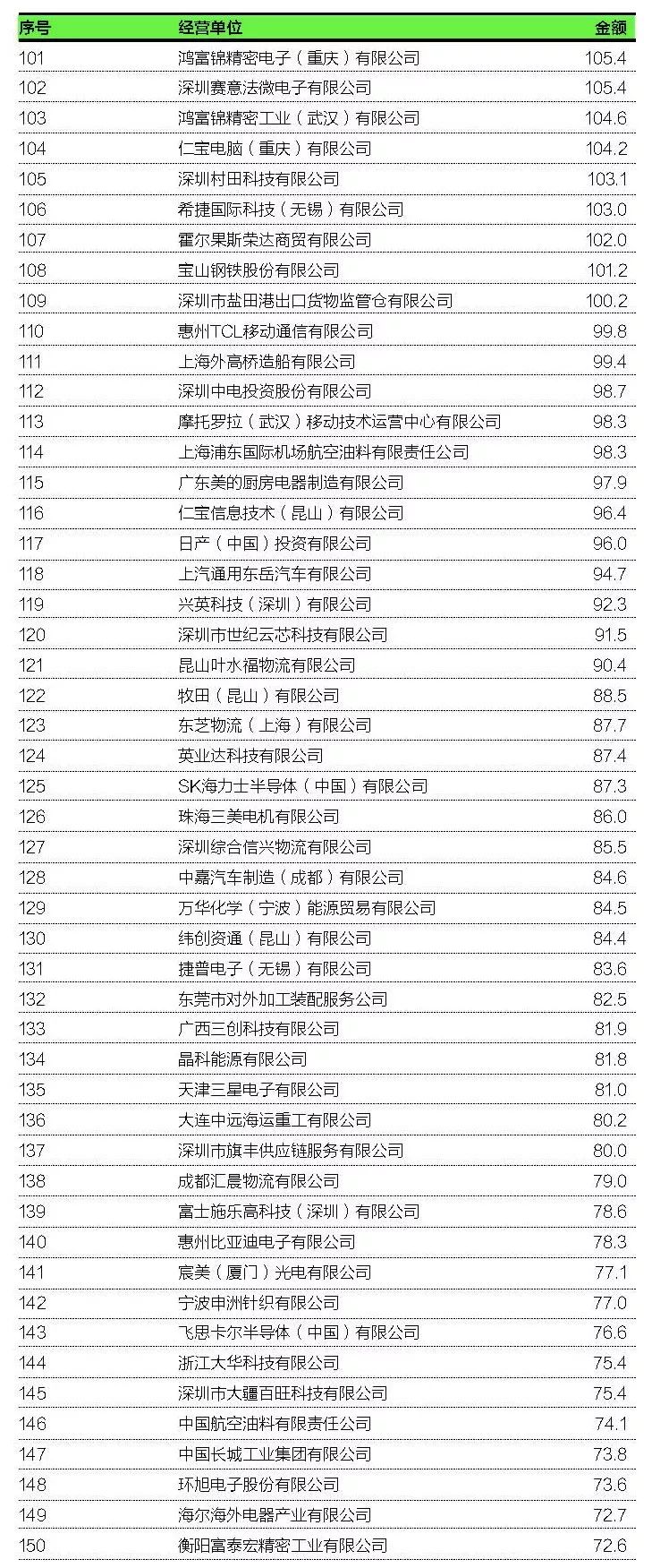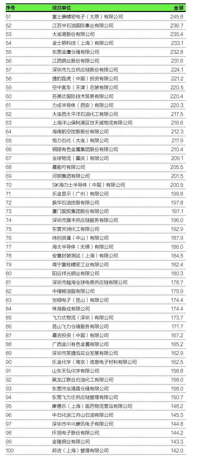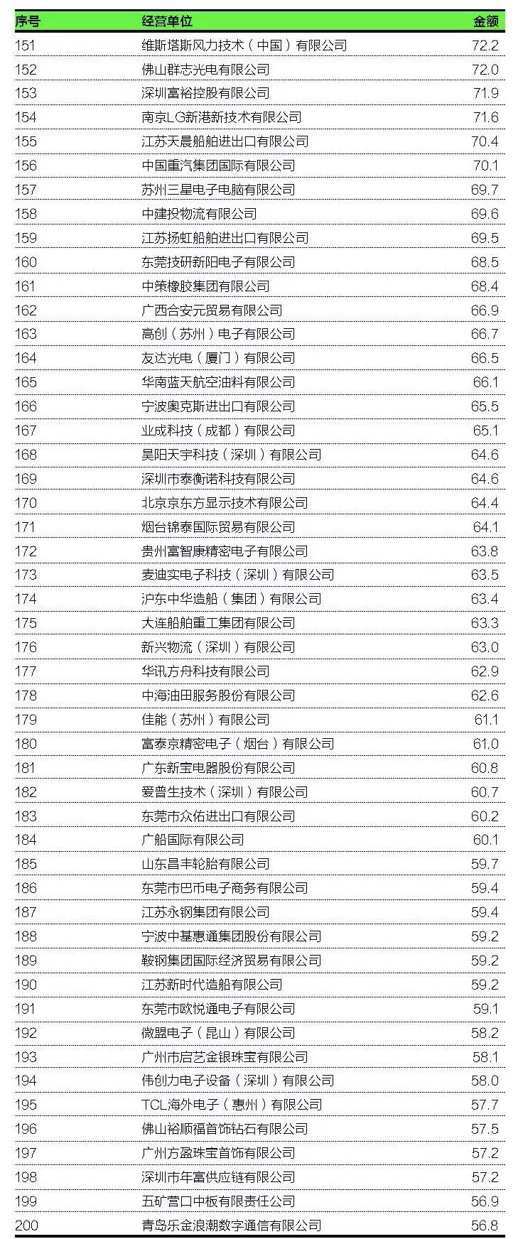 有80家出口企業(yè)和61家進(jìn)口企業(yè)在各自榜單上的位次取得了新進(jìn)步,上升幅度最大的深圳市裕展精密科技有限公司在出口200強(qiáng)總榜單上的位次由上年第162位跳升至第31位。