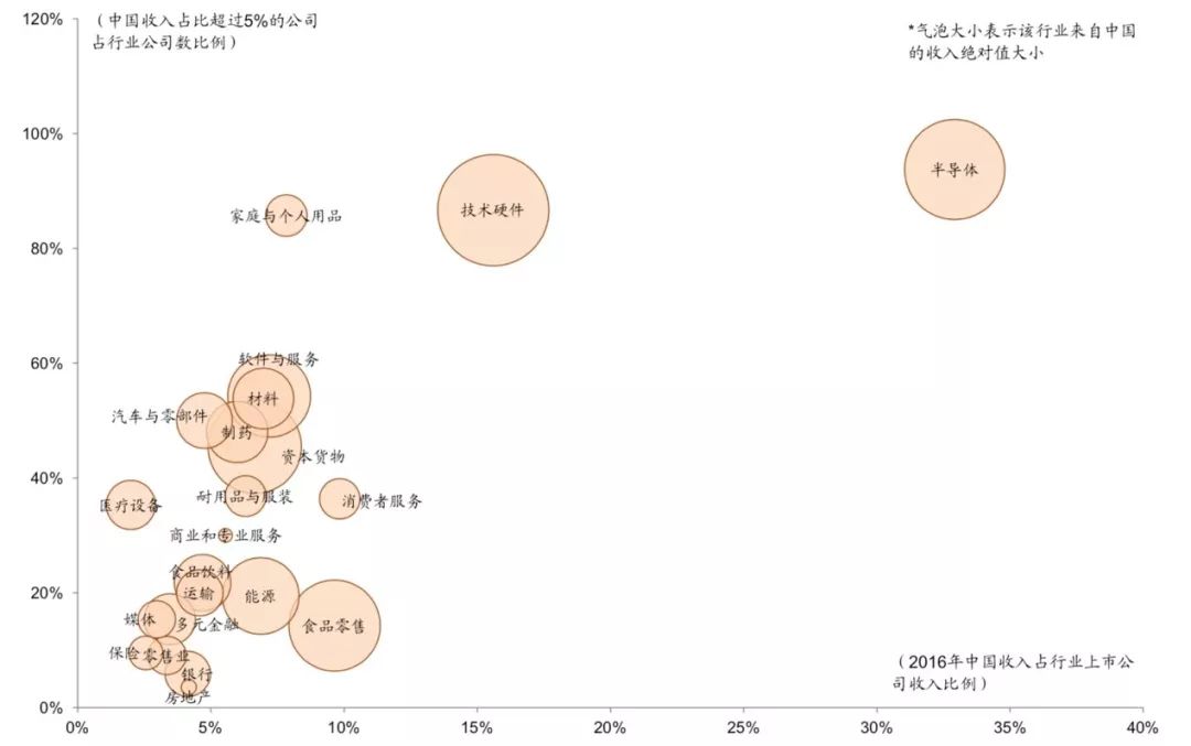 圖7 標普500成分股中半導體(33%)、技術硬件(16%)等價值鏈上游行業的中國收入占比及收入絕對值較高