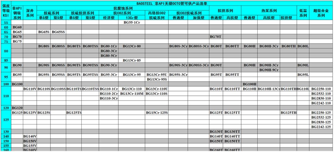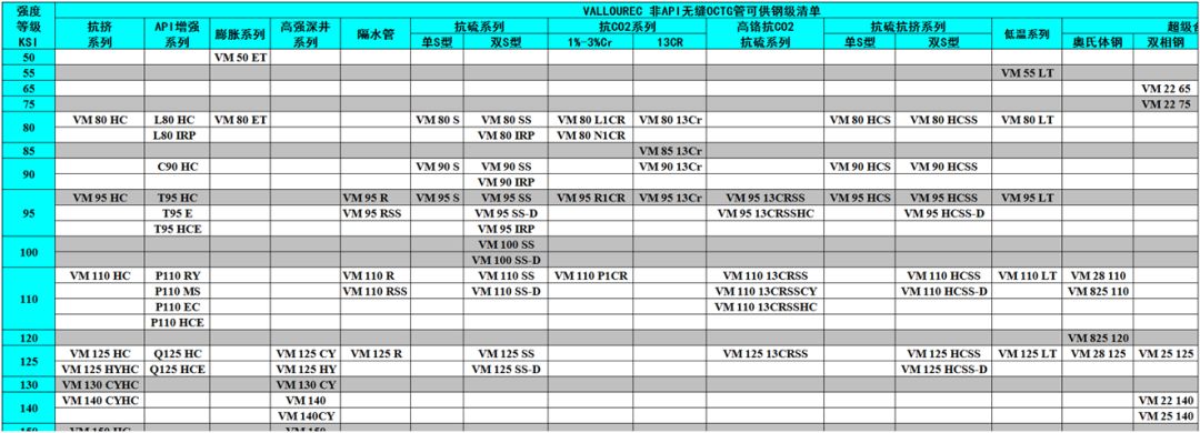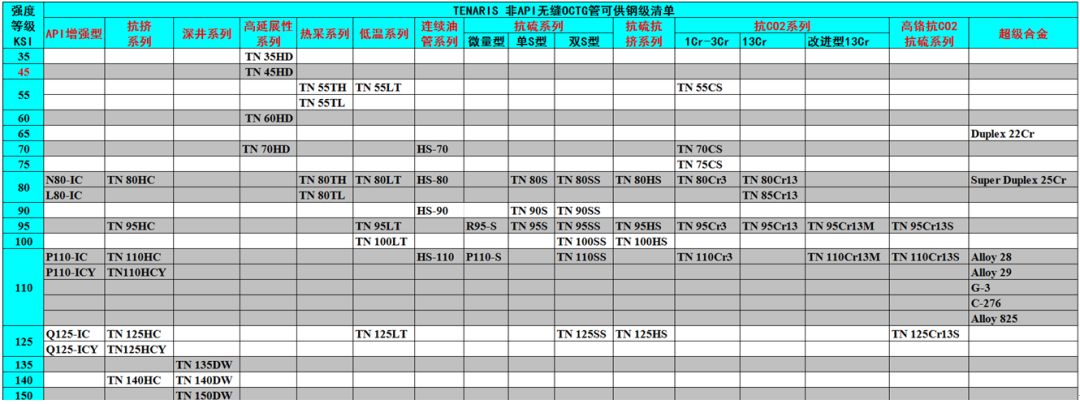產(chǎn)品特色:一共有60個鋼級,最高鋼級是170ksi。擁有比較全面的產(chǎn)品系列,其儲氣井系列自行劃分出系列,有一定特色。目前還未明確分類并供應(yīng)高延展性、非標(biāo)鋼級、膨脹套管、API增強(qiáng)型、低溫和連續(xù)油管等五個系列。