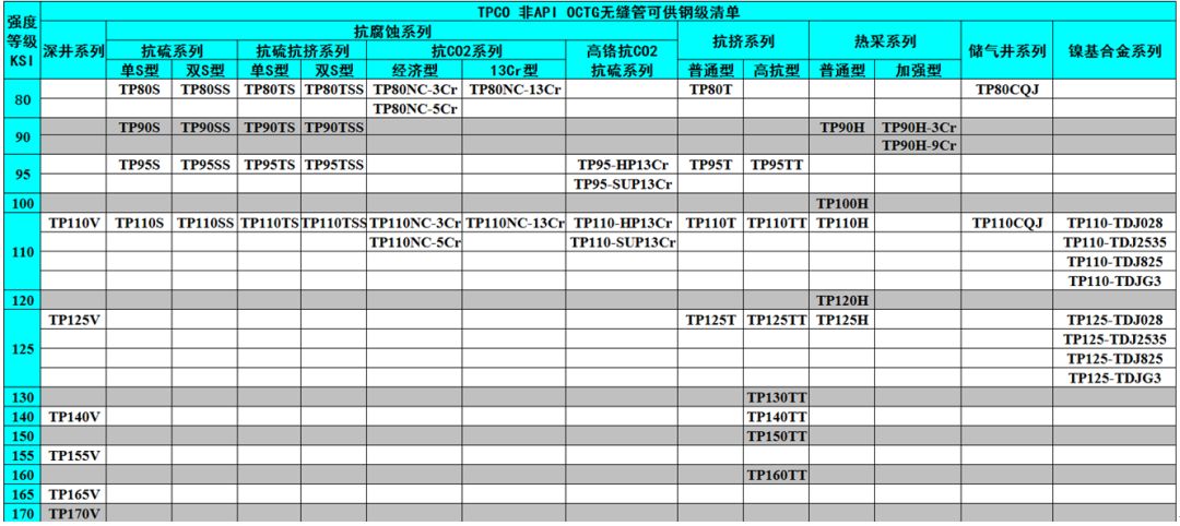 為適應(yīng)油田各類井況的發(fā)展,為油田提供安全可靠的井下服務(wù)。國內(nèi)外油井管生產(chǎn)廠家紛紛開發(fā)非標(biāo)API油井管,本文從各家網(wǎng)站收集整理了各家鋼廠的非標(biāo)油井管可供鋼級表,并簡要分析,供各大油田、生產(chǎn)、貿(mào)易相關(guān)人士研究和使用。本文收集的7個廠家為: