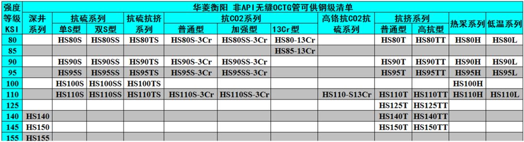 產(chǎn)品特色:一共有52個鋼級,最高鋼級是155ksi。在OCTG非標(biāo)鋼級上,近年開發(fā)量較大,有一定的供貨業(yè)績。目前在抗硫、抗CO2、抗擠、抗硫抗擠、深井、熱采、低溫等分類上,逐步形成較完整的產(chǎn)品系列。