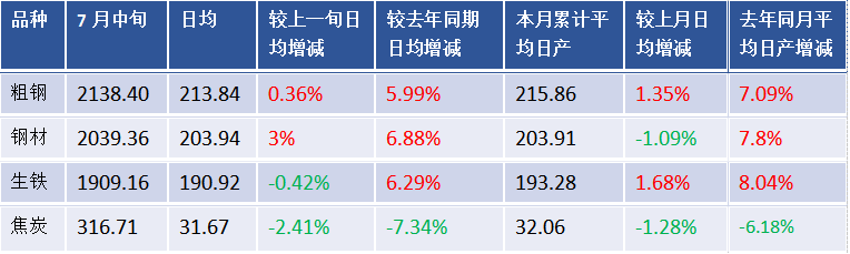 根據(jù)中鋼協(xié)數(shù)據(jù),7月中旬較7月上旬,重點(diǎn)統(tǒng)計(jì)鋼企粗鋼和鋼材產(chǎn)量均呈現(xiàn)環(huán)比上升,其中粗鋼日均產(chǎn)量213.84萬(wàn)噸,較去年同期增5.99%,鋼材日均產(chǎn)量203.94萬(wàn)噸,較去年同期增加6.88%。