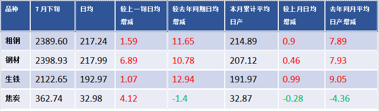 根據(jù)中鋼協(xié)數(shù)據(jù),2020年7月下旬,重點統(tǒng)計鋼企粗鋼2389.60萬噸、生鐵2122.65萬噸、鋼材2397.93萬噸、焦炭362.74萬噸。平均日產(chǎn)來看,生鐵、粗鋼和鋼材環(huán)比同比均呈現(xiàn)上漲。粗鋼217.24萬噸,環(huán)比增長1.59%、同比增長11.65%;生鐵192.97萬噸,環(huán)比增長1.07%、同比增長12.94%;鋼材217.99萬噸,環(huán)比增長6.89%、同比增長10.78%。