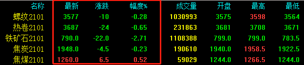 期貨低位震蕩,有止跌企穩(wěn)的跡象。期螺盤中一度翻紅,但最終收跌。期螺下跌10收報3577,期卷下跌24收報3687,鐵礦石下跌22收報790,焦炭下跌4.5收報1948,焦煤上漲6.5收報1260。