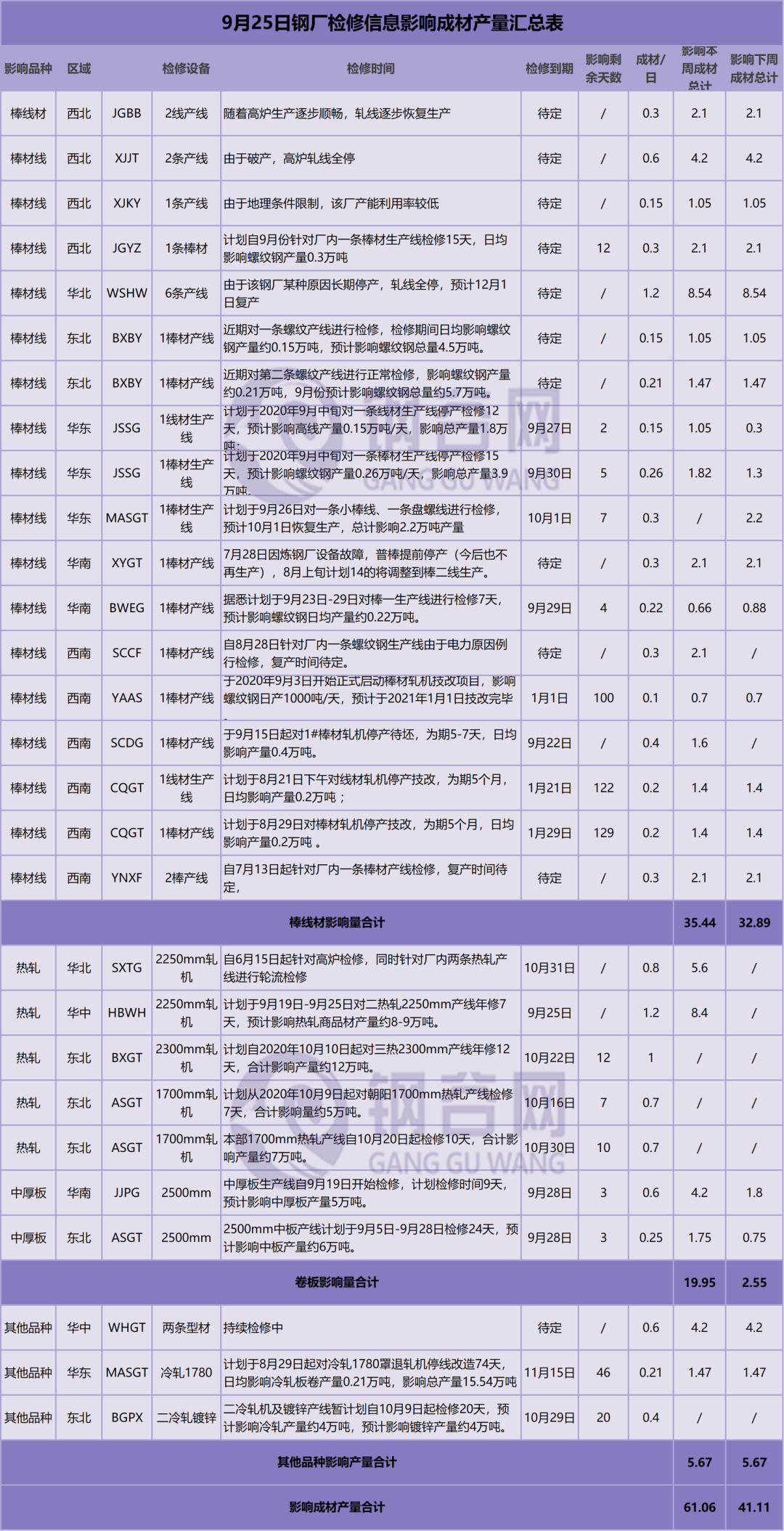 1、 MASGT已于9月26日對一條小棒線、一條盤螺線進行檢修,預計10月1日恢復生產,總計影響2.2萬噸產量;