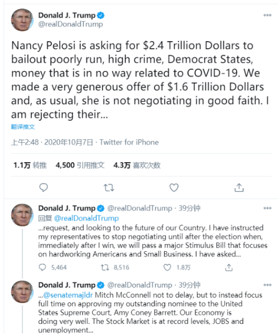 特朗普推文表示,我們給出了非常慷慨的1.6萬億美元的方案,而眾議院議長南希·佩洛西,一如既往的沒有真誠談判的意思。且他已指示白宮代表即時(shí)停止與民主黨人的磋商工作,押后直至11月大選后、當(dāng)他贏得連任才立即恢復(fù)商討,屆時(shí)共和黨將會(huì)通過一項(xiàng)重大刺激方案,向勤勞的美國民眾和中小企業(yè)提供援助。