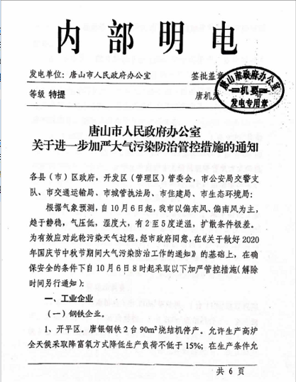 唐山市關(guān)于進(jìn)一步加嚴(yán)大氣污染防治管控措施的通知。各縣(市)區(qū)政府,開發(fā)區(qū)(管理區(qū))管委會(huì),市公安局交警支隊(duì)、市交通運(yùn)輸局、市城管執(zhí)法局、市住建局、市生態(tài)環(huán)境局:根據(jù)氣象預(yù)測,自10月6日起,我市以偏東風(fēng)、偏南風(fēng)為主,趨于靜穩(wěn),氣壓低,濕度大,有2至5度逆溫,擴(kuò)散條件板差。為有效應(yīng)對此輪污染天氣過程,經(jīng)市政府同意,在《關(guān)于做好2020年國慶節(jié)中秋節(jié)期間大氣污染防治工作的通知》的基礎(chǔ)上,在確保安全的條件下自10月6日8時(shí)起采取加嚴(yán)管控措施(解除時(shí)間另行通知)。