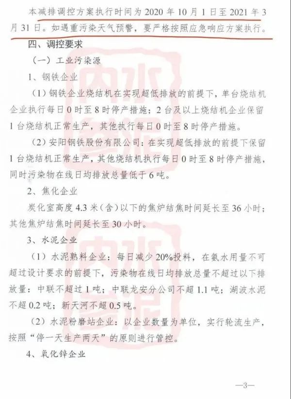 日前,河南省安陽市龍安區發布《2020-2021秋冬季重點污染源減排調控方案》,要求: