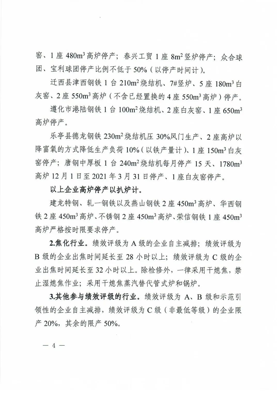 遷安市燕山鋼鐵90m2和132m2燒結機、1座14m2豎爐、3座140mm3白灰窯停產,1座2560m3高爐停產60天;鑫達鋼鐵1臺160m2燒結機、1座14m2豎爐、1座580m3高爐、8座230m3白灰窯停產;九江鋼鐵5#90m2燒結機和1臺152m2燒結機、2座10m2豎爐、2座480m3高爐停產;松汀鋼鐵198m2燒結機每月停產15天、1座1080m3高爐停產70天、3座180m3白灰窯停產;榮信鋼鐵1臺200m2燒結機、1座10.5m2豎爐、1座350m3白灰窯、1座480m3高爐停產;春興工貿1座8n?豎爐停產;眾合球團、寶利球團停產比例不低于50%(以停產時間計)。