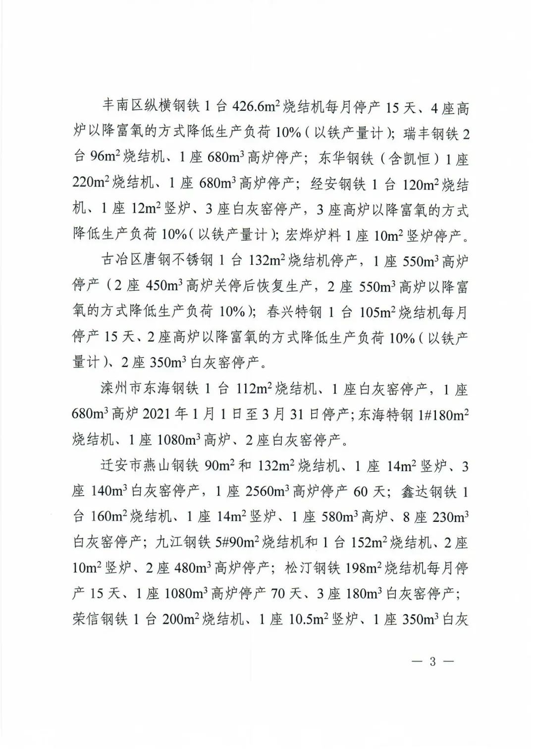 灤州市東海鋼鐵1臺112m2燒結機、1座白灰窯停產,1座680m3高爐2021年1月1日至3月31日停產;東海特鋼1#180m2燒結機、1座1080m3高爐、2座白灰窯停產。