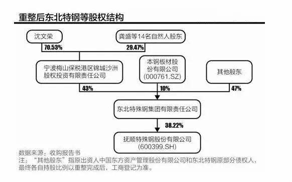 東北特鋼集團2017年完成重組。股權結構為錦程沙洲43%,本鋼10%,債權人47%。錦程沙洲屬沙鋼系,為重組后第一大股東和實際控制人。該重組標志著我國特殊鋼企業兼并重組和混合所有制改革正縱深推進。