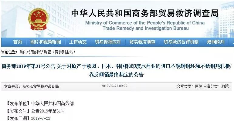 7月23日,國家商務部決定對原產于歐盟、日本、韓國和印度尼西亞的進口不銹鋼鋼坯和不銹鋼熱軋板/卷征收反傾銷稅,稅率為18.1%-103.1%不等,征收期限為5年。