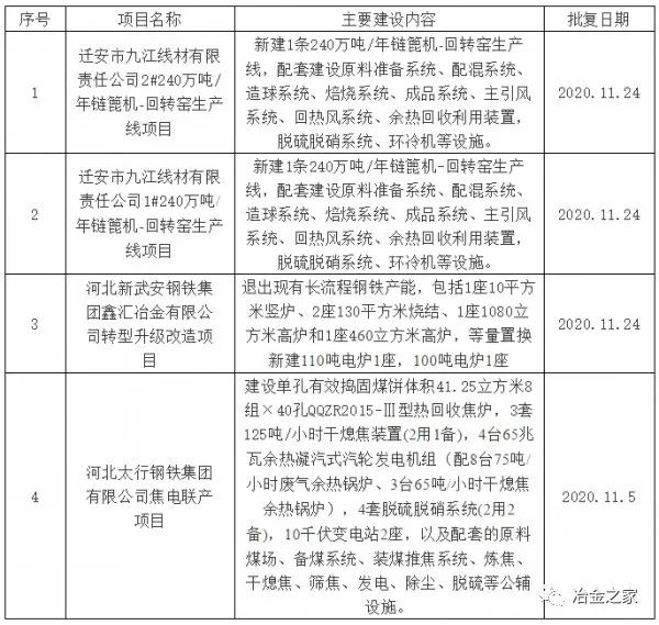 河北省生態環境廳2020年11月共作出4個項目環境影響評價報告書的批復,均為鋼鐵企業項目,具體見下表: