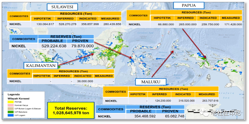印尼現有紅土鎳礦區域分布圖,主要分布在蘇拉威西島和北馬魯古島群。