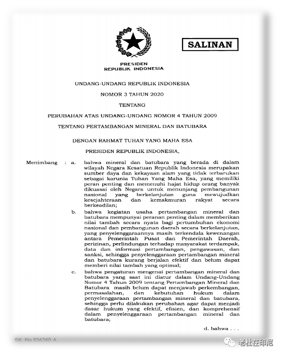 2020印尼礦業法修正案的主要內容: