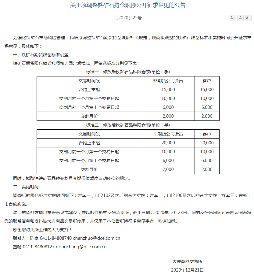 緊接著,發(fā)布“關(guān)于就調(diào)整鐵礦石持倉限額公開征求意見的公告”稱,為強(qiáng)化鐵礦石市場風(fēng)險(xiǎn)管理,大商所擬調(diào)整鐵礦石期貨持倉限額相關(guān)規(guī)定,就擬調(diào)整的鐵礦石限倉標(biāo)準(zhǔn)和實(shí)施時(shí)間公開征求市場意見。