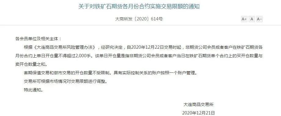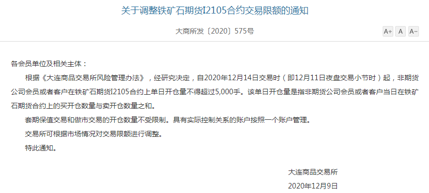 早在12月9日,大商所發(fā)布了“關(guān)于調(diào)整鐵礦石期貨I2105合約交易限額的通知”,決定自2020年12月14日交易時(shí)(即12月11日夜盤交易小節(jié)時(shí))起,非期貨公司會員或者客戶在鐵礦石期貨I2105合約上單日開倉量不得超過5000手。該單日開倉量是指非期貨公司會員或者客戶當(dāng)日在鐵礦石期貨合約上的買開倉數(shù)量與賣開倉數(shù)量之和。