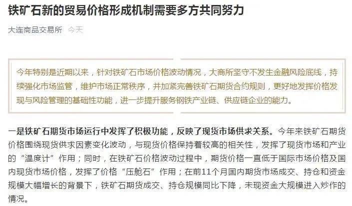 其實(shí),20日夜間,大商所便發(fā)聲表示,鐵礦石新的貿(mào)易價(jià)格形成機(jī)制需要多方共同努力!大商所認(rèn)為,要改變現(xiàn)有市場格局和定價(jià)機(jī)制,需要期現(xiàn)行業(yè)相向而行,形成合力,完善市場平衡機(jī)制,通過期貨市場建立新的貿(mào)易價(jià)格形成機(jī)制。在此過程中,大商所理當(dāng)發(fā)揮積極作用。大商所將堅(jiān)守不發(fā)生金融風(fēng)險(xiǎn)底線,持續(xù)強(qiáng)化市場監(jiān)管,維護(hù)市場正常秩序。大商所表示,今年來鐵礦石期貨價(jià)格圍繞現(xiàn)貨供求因素變化波動(dòng),與現(xiàn)貨價(jià)格保持著較高的相關(guān)性。在前11個(gè)月國內(nèi)期貨市場成交、持倉和資金規(guī)模大幅增長的背景下,鐵礦石期貨成交、持倉規(guī)模同比下降,未現(xiàn)資金大規(guī)模進(jìn)入炒作的情況。
