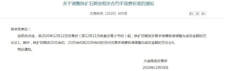 12月18日,大商所發(fā)布“關(guān)于調(diào)整鐵礦石期貨相關(guān)合約手續(xù)費(fèi)標(biāo)準(zhǔn)的通知”,決定自2020年12月22日交易時(shí)(即12月21日夜盤交易小節(jié)時(shí))起,鐵礦石期貨交易手續(xù)費(fèi)標(biāo)準(zhǔn)調(diào)整為成交金額的萬分之一。其中,鐵礦石期貨2101合約、2105合約和2109合約的日內(nèi)交易手續(xù)費(fèi)標(biāo)準(zhǔn)調(diào)整為成交金額的萬分之四。