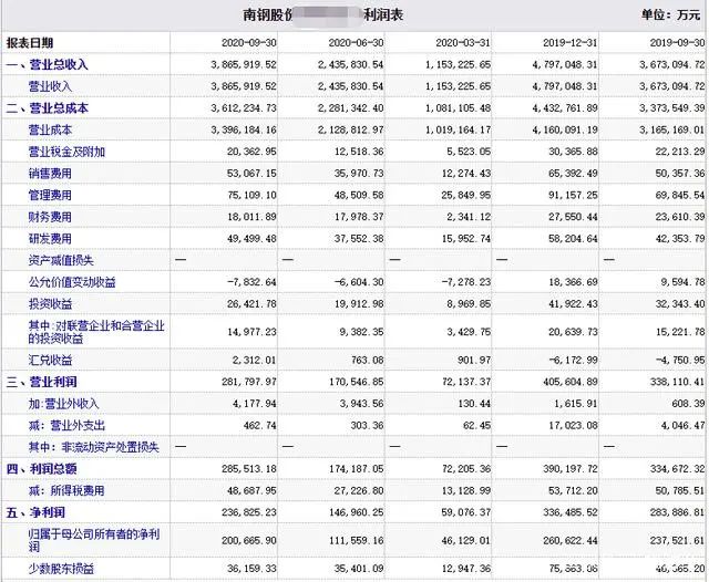 2019年南鋼凈利潤26億元,而截止2020年第三季度,南鋼的凈利潤只有20億元,這個利潤跟去年同期相比下滑15.6%;
