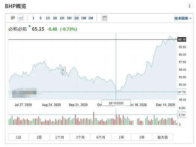 在10月底的時候,必和必拓的股價還維持在48美元左右,但截至目前必和必拓的股價已經(jīng)上漲到65美元左右,相當于兩個月左右的時間漲幅達到35%。