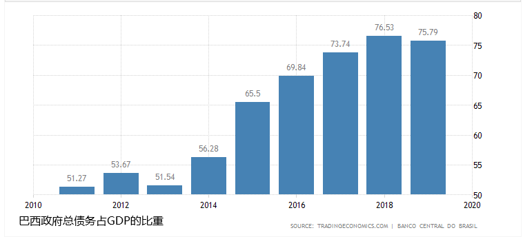 在沒有發生疫情之前,巴西政府的債務壓力本身就比較大,特別是在2008年發生金融危機之后,巴西的經濟一直萎靡不振, GDP增速長期低于2%,在這種背景之下巴西政府的債務不斷增多,截止2019年末,巴西政府債務占GDP的比重已經達到75%以上。