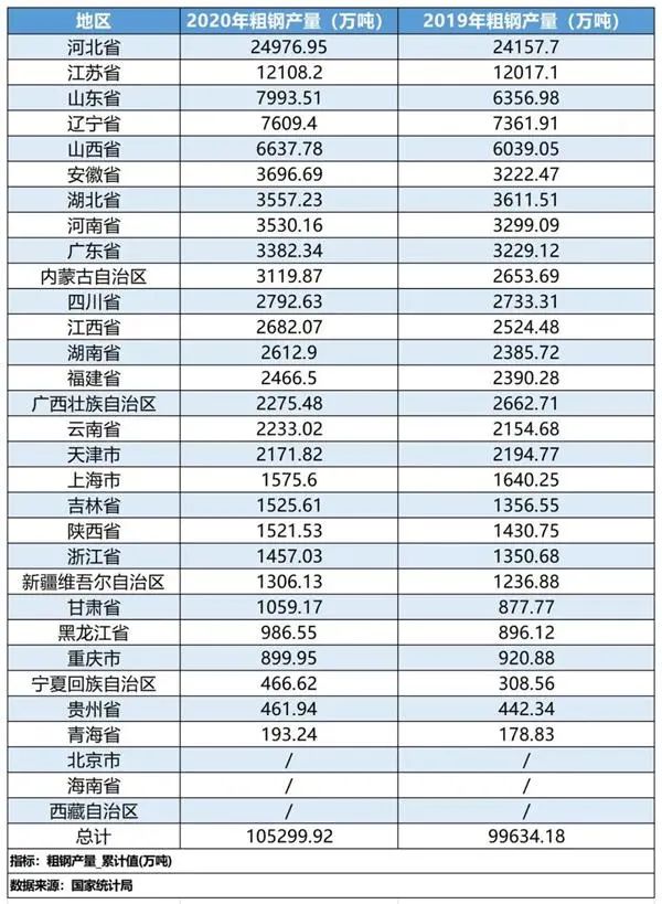 近日,國家統計局公布了2020年31省市自治區粗鋼產量數據。數據顯示,2020年河北省粗鋼產量24976.95萬噸,位居第一。