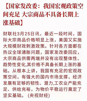 財(cái)聯(lián)社3月25日訊,全球通脹問(wèn)題受熱議,國(guó)家發(fā)改委回應(yīng):我國(guó)宏觀政策空間充足,大宗商品不具備長(zhǎng)期上漲基礎(chǔ)。
