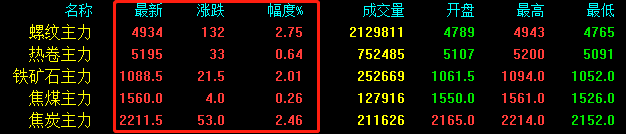 期鋼上漲132收報4934,期卷上漲33收報5195,鐵礦石上漲21.5收報1088.5,焦煤上漲4收報1560,焦炭上漲53收報2211.5。