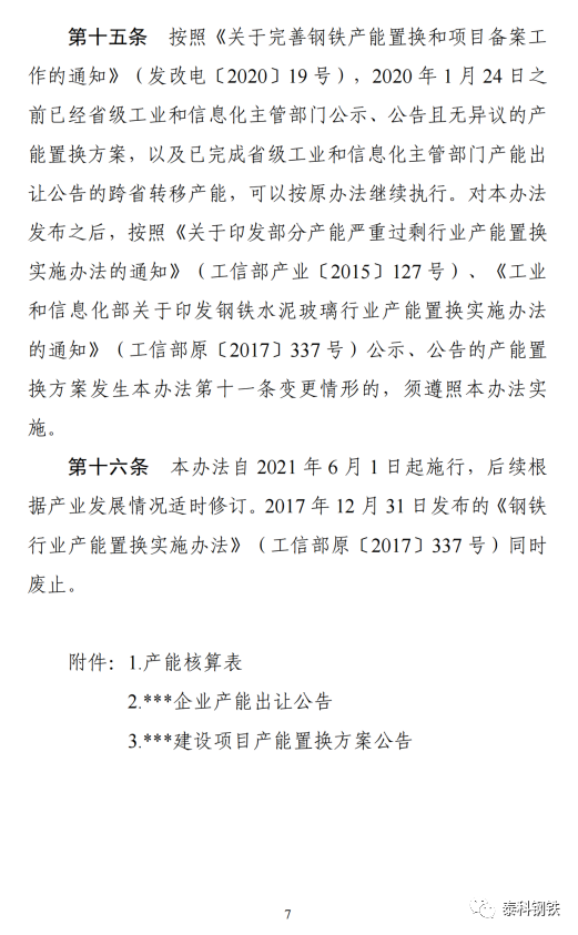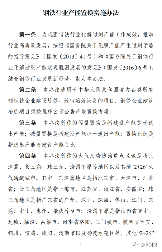 據工業和信息化部5月6日消息,為適應鋼鐵行業發展新形勢,貫徹新發展理念,構建新發展格局,更好地推動高質量發展,按照鋼鐵煤炭行業化解過剩產能和脫困發展工作部際聯席會議安排,工信部對原產能置換實施辦法進行修訂,出臺了《鋼鐵行業產能置換實施辦法》,自2021年6月1日起實施。大氣污染防治重點區域嚴禁增加鋼鐵產能總量。未完成鋼鐵產能總量控制目標的省(區、市),不得接受其他地區出讓的鋼鐵產能。長江經濟帶地區禁止在合規園區外新建、擴建鋼鐵冶煉項目。大氣污染防治重點區域置換比例不低于1.5:1,其他地區置換比例不低于1.25:1。