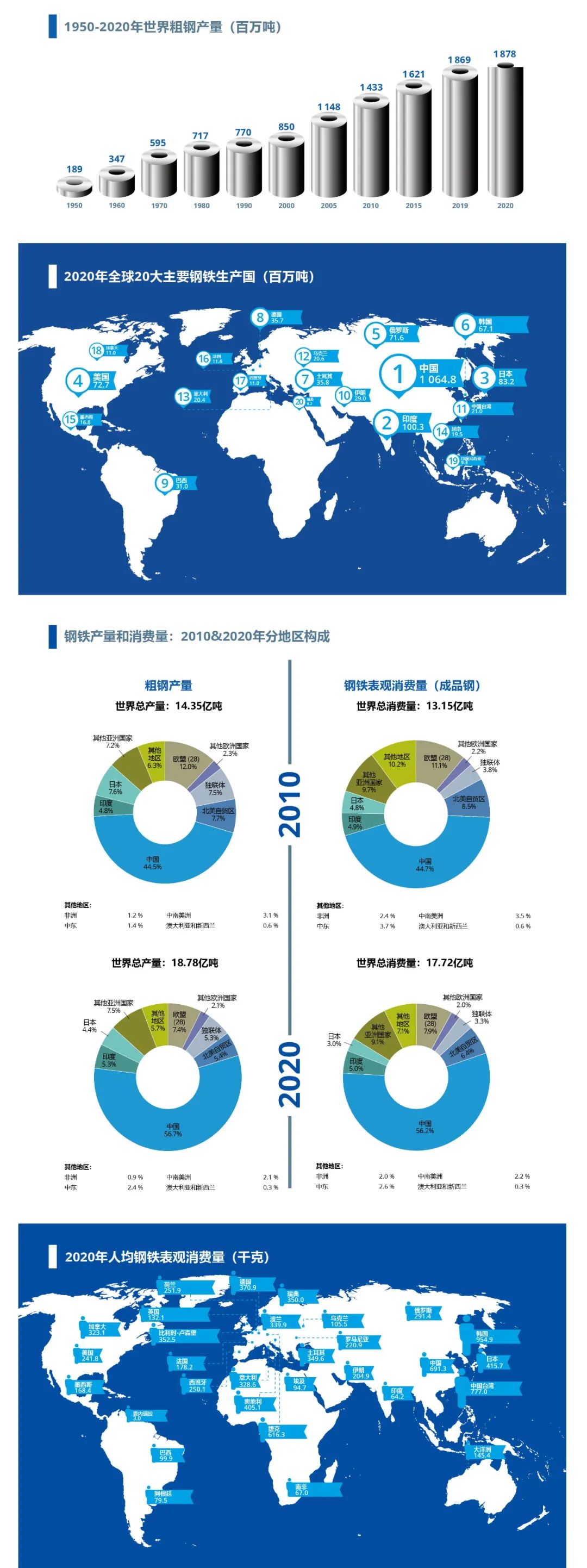 6月3日,世界鋼鐵協會發布《世界鋼鐵統計數據 2021》,根據該報告,2020年,中國粗鋼產量達到10.65億噸,位列全球第一,占全球粗鋼總產量比重為56.7%。