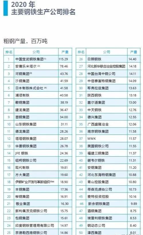 在2020年主要鋼鐵公司產量排名中,中國寶武鋼鐵集團粗鋼產量位列全球第一,包括太鋼、昆鋼、馬鞍山鋼鐵和重慶鋼鐵公司的產量在內,中國寶武粗鋼總產量達到1.15億噸。