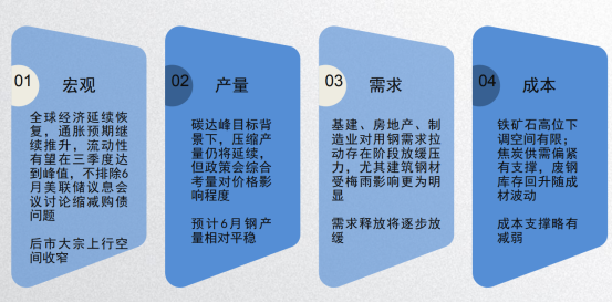 從政策倡導“保供穩(wěn)價”的角度來看,短期大面積限產(chǎn)減產(chǎn)可能性不大,但下半年在碳達峰目標下,確保粗鋼產(chǎn)量同比下降仍是核心,后期對鋼價仍有支撐。