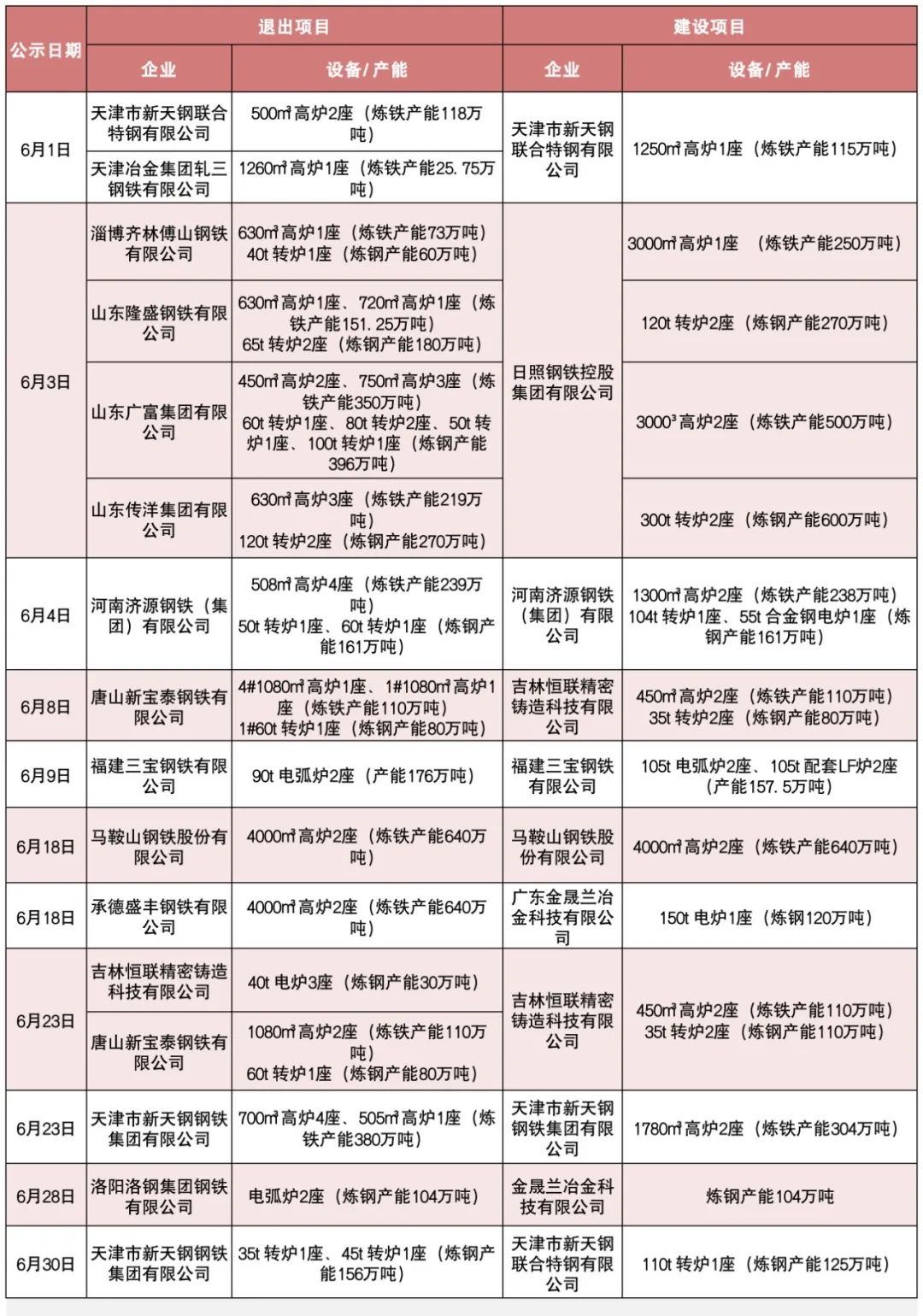 2021年6月1日,新版《鋼鐵行業產能置換實施辦法》(簡稱《辦法》)正式施行。新版《辦法》修訂后,將促進鋼鐵行業加快適應為滿足碳達峰目標而實施綠色低碳發展的迫切要求,推動行業轉型升級高質量發展。據不完全統計,6月份以來,有11個鋼鐵產能置換項目公示發布,具體如下圖: