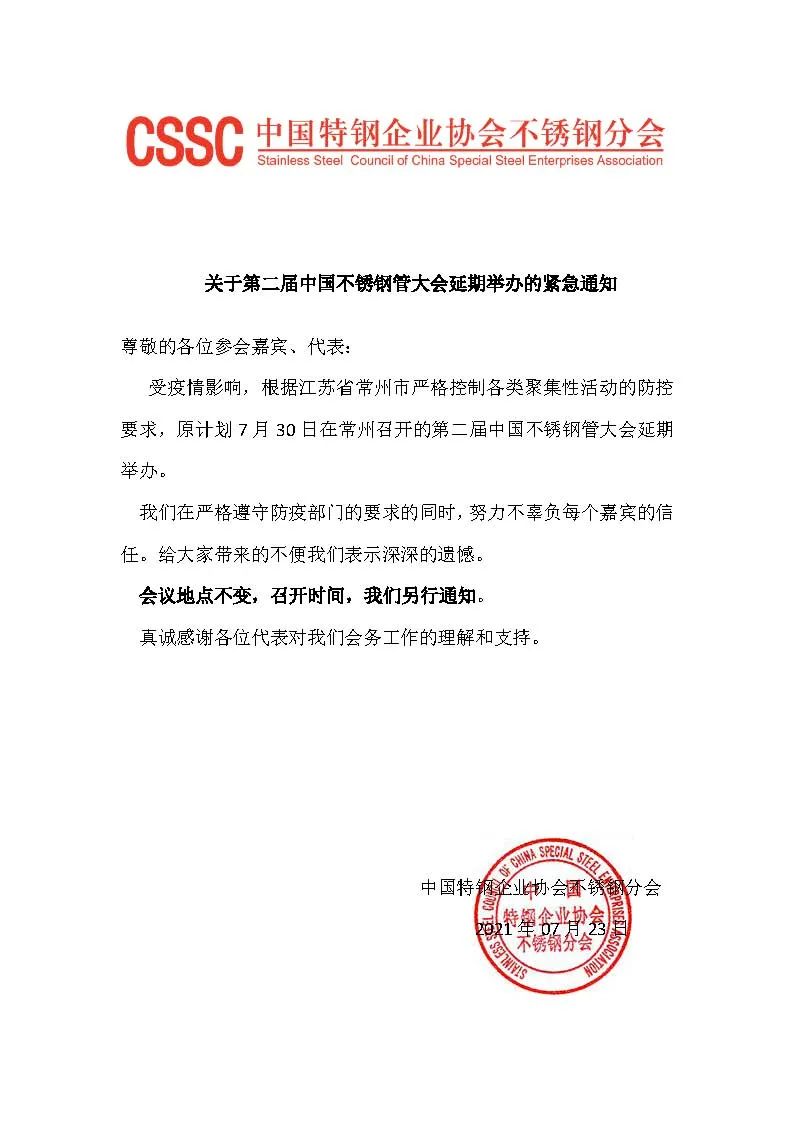 受疫情影響,根據江蘇省常州市嚴格控制各類聚集性活動的防控要求,原計劃7月30日在常州召開的第二屆中國不銹鋼管大會延期舉辦。