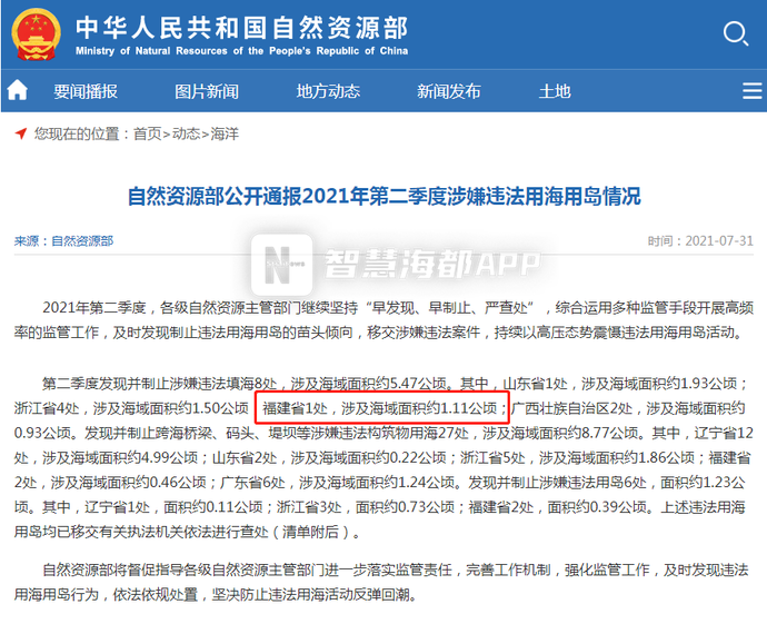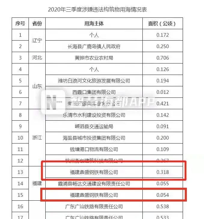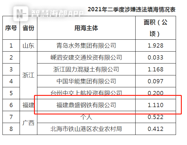 海都君了解到,日前自然資源部通報2021年第二季度涉嫌違法用海用島情況,鼎盛鋼鐵涉嫌違法填海1.110公頃,在被通報的違法填海情況中排名第三。