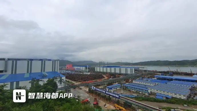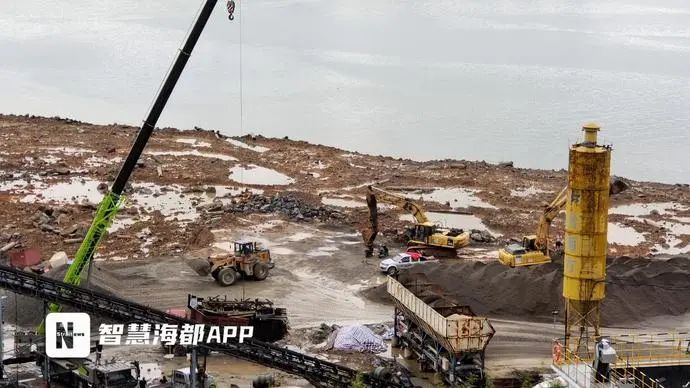 從高處俯瞰整片工地,可看到工地位于內海的南側,不少廠房建設完工,一些渣土車和推土機在廠區內來回運輸。在工廠的一側,可以看到一處被填埋的海域還沒有恢復原貌,三四臺挖掘機和推土機正在作業,一旁還有水泥攪拌車。