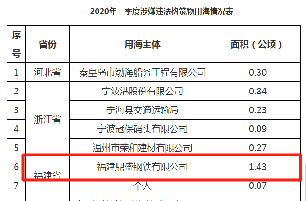海都君查詢發現,鼎盛鋼鐵涉嫌違法用海已不是第一次;在去年第一季度和第三季度,也曾被自然資源部通報過,涉嫌違法構筑物用海1.43公頃和0.372公頃,第一季度在全國排名第一位。