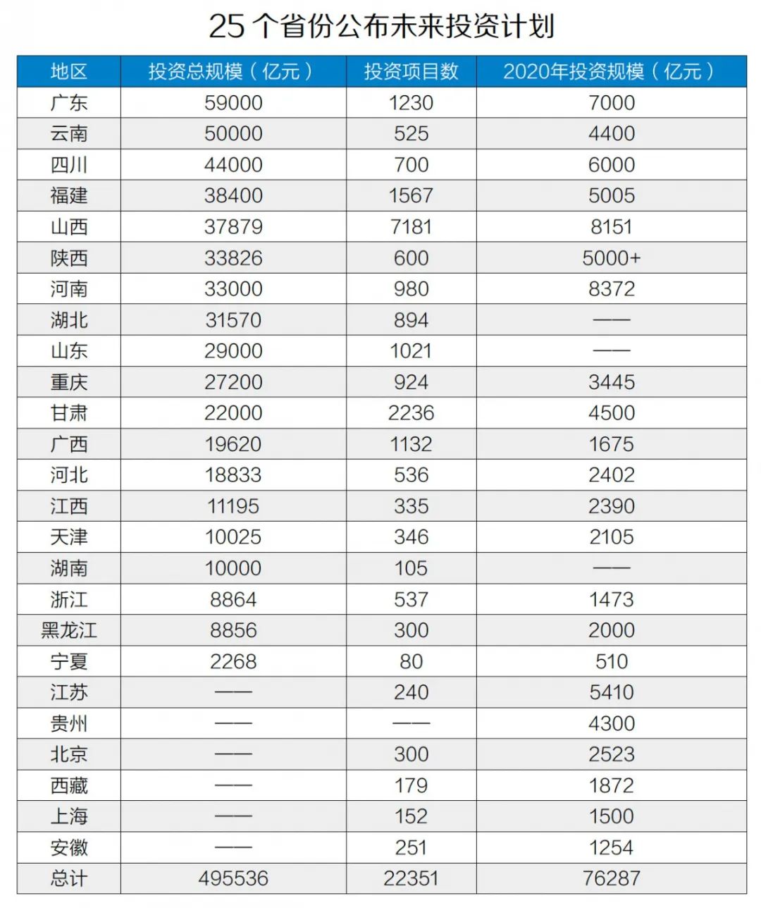 不僅如此,為推動經濟復蘇,各個地方政府密集公布了2020年重大項目投資計劃,一波基建投資已經在路上。隨著各地重點工程的復工及一批重點項目名單的下發,近50萬億元的投資版圖浮出水面。非常時期,新一輪大規模基建能否承擔起穩增長重任?或許,對于中國經濟而言,考驗才剛剛開始。據不完全統計發現,截至3月10日,有25個省區市公布了未來的投資規劃,2.2萬個項目總投資額達49.6萬億元,其中2020年度計劃投資總規模7.6萬億元。在穩增長的壓力下,近期基建項目的批復速度也在提高。近日,鐵路部門與地方政府聯手,統籌推進疫情防控和鐵路重點工程項目復工。截至3月15日,全國鐵路已有108個在建項目復工,項目復工率達93%;除2個湖北地區項目和6個位于東北、西北寒冷地區項目由于氣候原因暫未復工外,其他項目均已全部復工;今年計劃投產開通的項目已全部復工,復工率達100%。疫情之下,數十萬億基建項目如期而至。新型基礎設施建設(下稱“新基建”)項目尤為亮眼,成為本輪投資中的熱點。2018年12月中央經濟工作會議首次提出了新型基礎設施的概念,指出要“加大制造業技術改造和設備更新,加快5G商用步伐,加強人工智能、工業互聯網、物聯網等新型基礎設施建設”,因此,新基建主要是指與高技術產業相關的基礎設施。