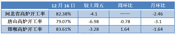 隨著期貨的拐頭向下,鋼材現(xiàn)貨報(bào)價(jià)進(jìn)一步下調(diào)。日內(nèi)建材跌幅加大,華北地區(qū)最大跌幅超100,板材穩(wěn)中部分市場也開始下調(diào),熱卷跌幅10-40。鋼坯自12月8日以來持續(xù)下跌,至12月17日累跌120至3340元/噸;唐山地區(qū)今日解除重污染應(yīng)急響應(yīng),本周增產(chǎn)壓力加大,鋼價(jià)將繼續(xù)下跌;期貨自昨日高位回落之后,繼續(xù)下行。期螺下跌28收報(bào)3484,下方3450有支撐,日線圖中MACD動(dòng)能柱已縮減至0軸,整體偏弱,螺紋短時(shí)震蕩,后市仍有下跌空間。熱卷下跌13收報(bào)3540,形態(tài)上收出一根下影線較長的錘子線,說明該位置獲得買盤支撐,下跌受阻,走勢強(qiáng)于螺紋。現(xiàn)貨方面:螺紋鋼普跌,且跌幅擴(kuò)大,全國主要市場下跌20-140,華北地區(qū)跌幅較大,均價(jià)下調(diào)39;熱卷穩(wěn)中部分下跌10-40,均價(jià)下調(diào)6;中板持穩(wěn),均價(jià)下調(diào)1。全國24個(gè)主要市場螺紋鋼 20mm HRB400E平均價(jià)格3899元/噸,較上個(gè)交易日下調(diào)39元/噸。全國24個(gè)主要市場4.75 熱軋板卷平均價(jià)格3877元/噸,較上個(gè)交易日下調(diào)6元/噸。全國23個(gè)主要市場14-20mm 普中板平均價(jià)格3815元/噸,較上個(gè)交易日下調(diào)1元/噸。1. 多地解除重污染預(yù)警 增產(chǎn)壓力加大12月17日,唐山政府下發(fā)關(guān)于解除重污染天氣Ⅱ級應(yīng)急響應(yīng)的通知,根據(jù)通知內(nèi)容,12月17日起,受冷空氣影響擴(kuò)散條件逐步改善,污染過程基本結(jié)束,自12月17日12時(shí)起全市解除重污染天氣Ⅱ級應(yīng)急響應(yīng)。此次環(huán)保限產(chǎn)從12月13日起執(zhí)行,共計(jì)4日。同時(shí),山西省臨汾市也于12月16日24時(shí)起解除了重污染天氣橙色預(yù)警。成都于12月16日零時(shí)起由橙色預(yù)警降級為黃色預(yù)警。根據(jù)監(jiān)測數(shù)據(jù),河北高爐開工率有所回落,但仍然保持在80%以上,隨著重污染預(yù)警的解除,本周增產(chǎn)壓力會(huì)隨之增加。距離新年不到半個(gè)月時(shí)間,需求回落壓力加大。尤其是建材,通常正常施工時(shí)間為3月15日至11月15日,其余時(shí)間作為冬季施工,北方地區(qū)會(huì)因?yàn)樘砑臃纼鲆旱却胧┰黾宇~外的養(yǎng)護(hù)費(fèi)用,冬季需求回落是大趨勢。目前東北地區(qū)工地已基本停工,華北、西北地區(qū)需求和運(yùn)輸也受到雨雪天氣影響面臨下降壓力,進(jìn)入12月末至1月初,各地運(yùn)輸將逐步停運(yùn),這也就意味著今年的行情將告一段落。而從近期的成交數(shù)據(jù)來看,相較11月,市場成交整體下行。且目前冬儲(chǔ)因價(jià)格高位仍沒有規(guī)模化開啟,貿(mào)易商采購謹(jǐn)慎,積極出貨。而這一心態(tài)很可能持續(xù)到年底。
